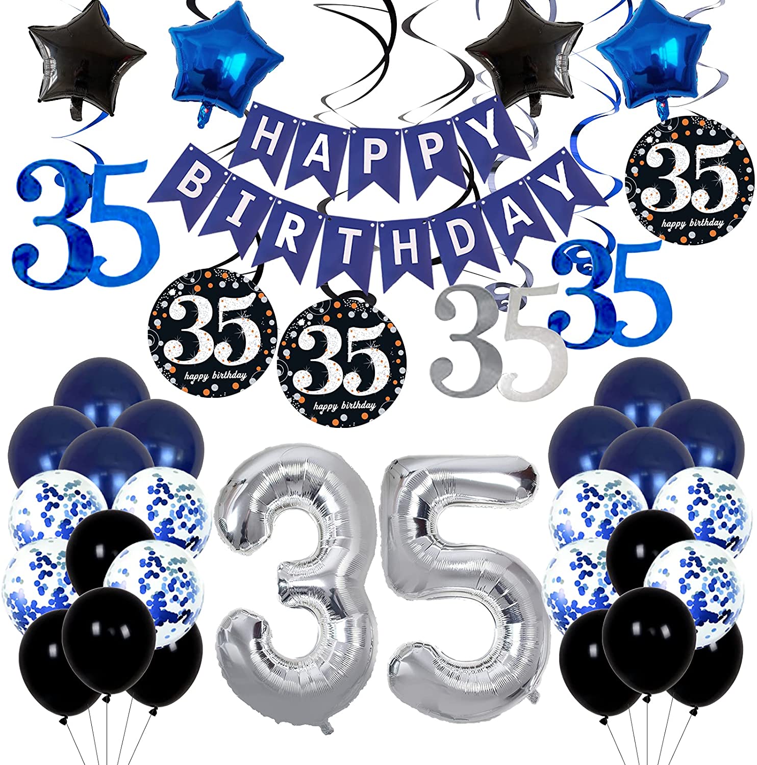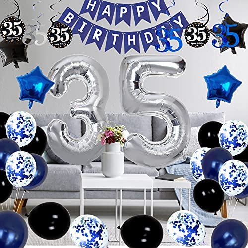Unforgettable Blue Party Decorations- Looking to welcome your thirties with open arms From the sparkling 35th birthday hanging swirls, number balloon, and birthday banner to the balloons in three style, this birthday decorations set will transform your event space in no time. Simply hang them by the attached ribbon using tape or putty (Not Included) to create a picture-perfect scene full of color and texture. Get All Your Party Supplies in One Package- HAPPY BIRTHDAY Banner; 3&0 Silver Aluminum Foil Number Balloon(40); 2 Black Star-Shaped Foil Balloons(18); 2 Dark Blue Star-Shaped Foil Balloons(18 inch); 8 Black Latex Balloons(12); 8 Navy Blue Latex Balloons(12); 8 Blue Confetti Latex Balloons(12); 1Pack Spiral Pendants of Number 35 , This beautiful birthday decorations set gives everything you need for planning perfect 35th birthday party. High Quality and Easy to Install- These balloons are made of premium latex and foil which is durable and can be reusable. You can easy to put them together and wont wave you too much time on it. (Number 35 balloons support by Helium ,Latex Balloons and Star- shaped balloons only allowed to blow by pump and supported by Helim , but recommed to blow balloons 3 to 4 hours before Party starts ) Great for All Occasions- Using this the glossy birthday balloons set creates a photo booth with a vivid balloon backdrop, make the elegant balloon bouquets to decorate your birthday party, or 35th anniversary party.You can hang these party decorations from the ceiling, or hang on a wall, also to decorate the dessert table, gift table, or drink station. Customer Services after Sale-Providing our customers with high-quality product and services is our goal, If there has any balloons or accessories missed or broken of this 35th birthday party supplies for men, please do not hesitate to contact us in email ,we will reply you in first sign.Wish you had a good shopping experience from us.