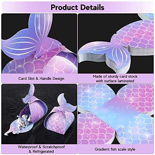 Mermaid candy boxes: our 36 pieces of mermaid goodie boxes will attract the eyes of most kids and the attention of children attending the party, which will create unforgettable moments Mermaid design: the mermaid treat boxes are easy to DIY and fold, and will be glued with a mermaid tail, you can create an under the sea mermaid-themed birthday party with these favor boxes, which can add a mermaid party atmosphere, and add a nice touch to your mermaid party with these adorable mermaid favors bags designs Quality material: the mermaid favor box is made of quality paper, odorless and safe to use, sturdy enough, and it is reliable for you to put food products, candies, chocolates, nuts, snacks and small toys inside, and you can use it with confidence; And use clear and bright printing, nice appearance to create mermaid theme atmosphere Easy to use: the mermaid present bags are suitable for small things packing, such as sweets, cupcakes and cookies, no need for any other tool, convenient to put in or take out candies, easy for kids to handle these bags Wide applications: these mermaid party present boxes are nice for filling foods and small gifts, ideal for various parties, festivals and celebrations, suitable as party favors for mermaid themed parties, masquerade, kids birthday parties, baby showers or any other mermaid themed party supplies