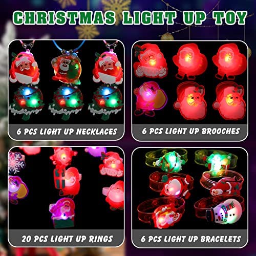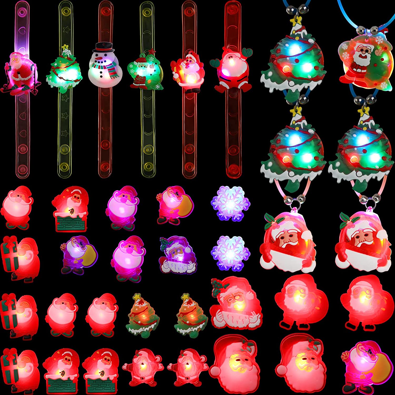 38 Pieces Christmas Party Favors for Kids Christmas Necklace Glow Light Rings Light up Bracelets Christmas Brooch LED Bracelets LED Flash Rings for Christmas Party Favors Stockings Toys Gifts