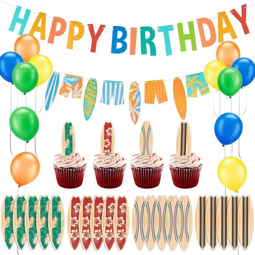 38 Pieces Surf Up Happy Birthday Garland Summer Banner Surfboard Cupcake Toppers Different Color Latex Balloons for Swimming Pool Summer Beach Party Birthday Baby Shower Party Supplies