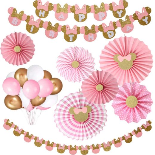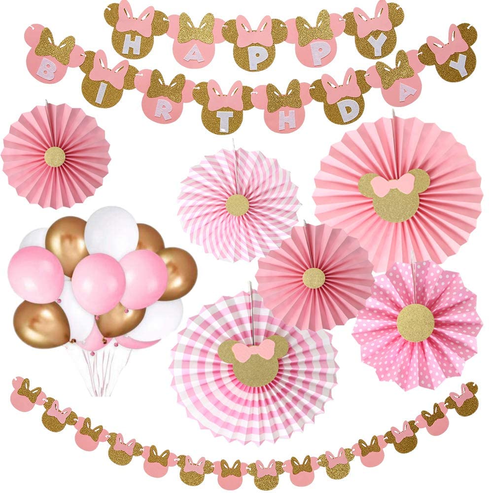 38pcs Minnie Mouse Party Supplies Decoration, Pink and Gold Minnie Paper Fans,Minnie Mouse Garland, Minnie Happy Birthday Banner,Balloons for Girls 1st 2nd 3rd Birthday Decorations