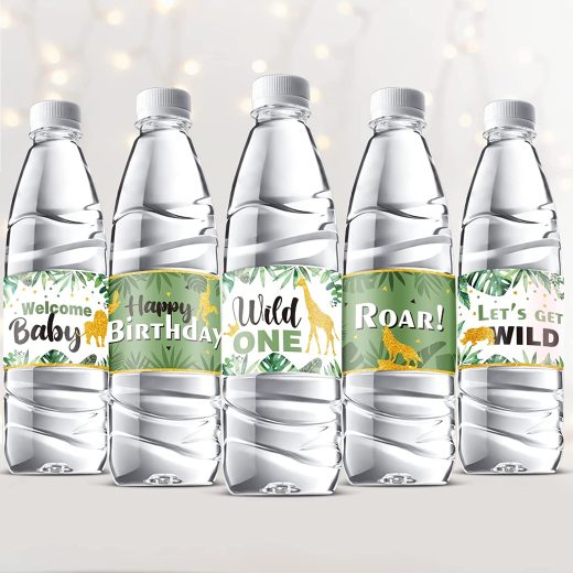 Features: Add them to a jungle animals themed baby shower or birthday party beverage bar for an impressive, coordinated display. The outer layer of the stickers is waterproof plastic, so you can safely put the pasted water bottles in ice cubes or in the refrigerator. Bottle sticker wrappers are full of classic wild animal elements, such as [Be BRAVE], [wild ONE], [ROAR], [Happy Birthday], [LETS GET WILD], [Welcome Baby], well catching guests eyes and easily bringing you a lively party atmosphere. They can be applied for various occasions, such as gender neutral and gender reveal party, animal themed birthday parties, baby sprinkle, jungle, fall, winter and camping themed baby showers. The waterproof baby shower water bottle labels will make the parties more lovely and charming, and you can give these gifts to your friends or relatives to express your love and care. Specifications: Material: paper Color: gold, black, white, green Size: approx. 8.5 inches wide and 2 inches tall Package includes: 39 x Bottle label stickers Notes: Attach to dry beverage containers for smoothest results. If the beverage is to be served chilled, attach the label while room temp and then refrigerate. Manual measurement, please allow slight errors on size. The color may exist a slight difference due to different screen displays.