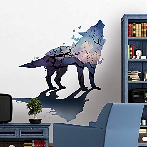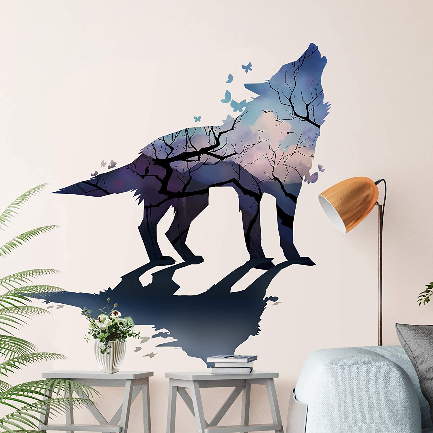 3D Purple Wolf Wall Decals Forest Wolf Butterfly Wall Stickers DIY Removable Jungle Dark Forest Night Wolf Shadow Wall Art Decor for Kids Baby Bedroom Living Room Nursery Playroom Decoration DT-9042