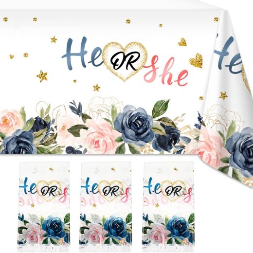 3Pack Gender Reveal Plastic He or She Tablecloths,Navy and Blush Table Cover 70u2019u2019×40u2019u2019 for Boy or Girl Baby Shower Gender Reveal Party Decorations