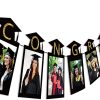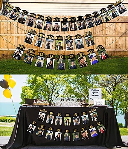 Package includes 3pcs graduation photo banners and 200pcs stickers in 3 sheets.With letters CONGRATS GRAD,”WE ARE SO PROUD OF YOU”,”YOU DID IT”,”WAY TO GO”.Each banner measures 9.84ft. Made of sturdy cardboard.There are 31 frames in total which is perfect for displaying your photos from kindergarten through university! The card measures 5”x 7”.Perfect for 4x 4, 4x 6 or 5x 7 vertical photos.Easy to stick the photos to the banner with some glue or adhesive tape. Comes assembled!Hang it across a party table, tape to a wall, window, from the ceiling, or string across a fence or between tree branches, etc. Celebrate your graduation party with this one of a kind photo banner!Perfect touch for your 2021 grad party celebration decorations.