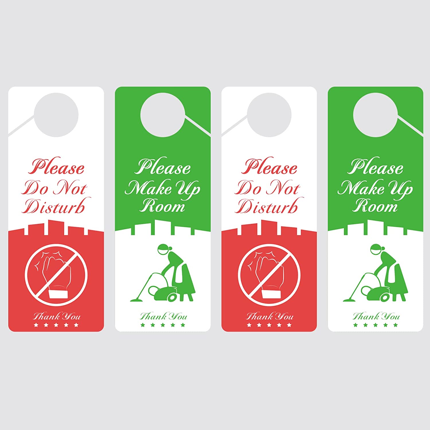 Printed on Both Sides: -Please Make Up Room & Please Do Not Disturb packet including:2 Pack please clean up room Door Sign Size:9×3.5 Material:PVC Plastic Applicable Place:Hotel, Apartment,Bar, Office, Hospital, Law Firms Etc. Advantage: 1.It is durable yet flexible fits with almost any door handle. 2.Prevent unwanted or unauthorized visitors from interrupting you. 3.Clearly shows that you dont want to be disturbed and need privacy at that moment.
