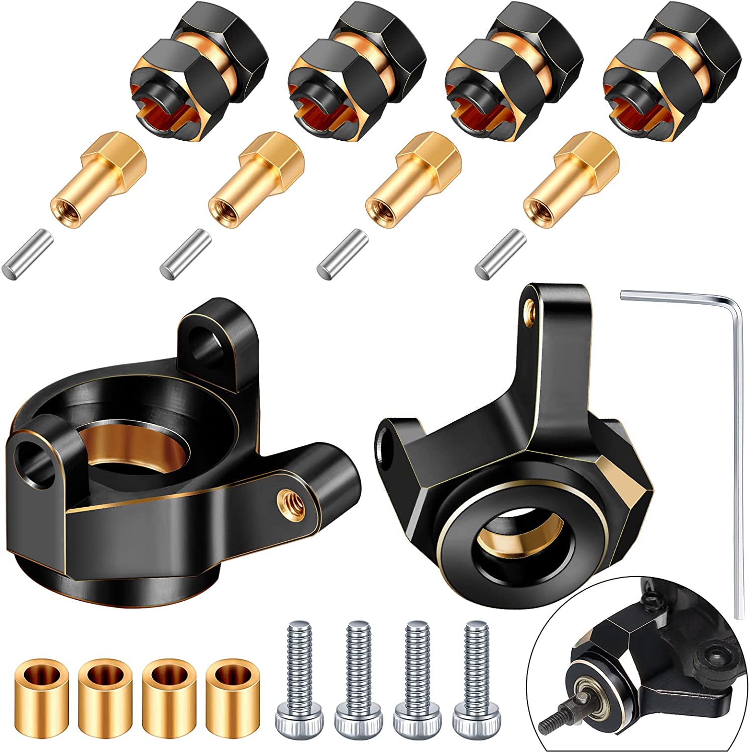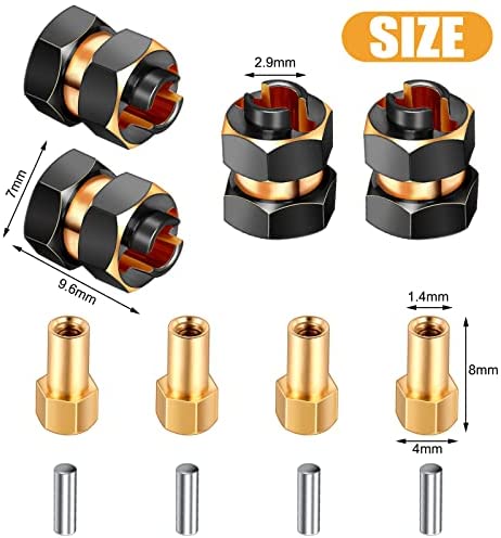 4 Pieces Brass Extended 7mm Wheel Hex Hub Extension 8mm Thick and 2 Pieces Brass Steering Knuckle Compatible with AXIAL SCX24 AXI90081 Upgrades Parts 1/24 RC Crawler Car Accessories (Black-Golden)