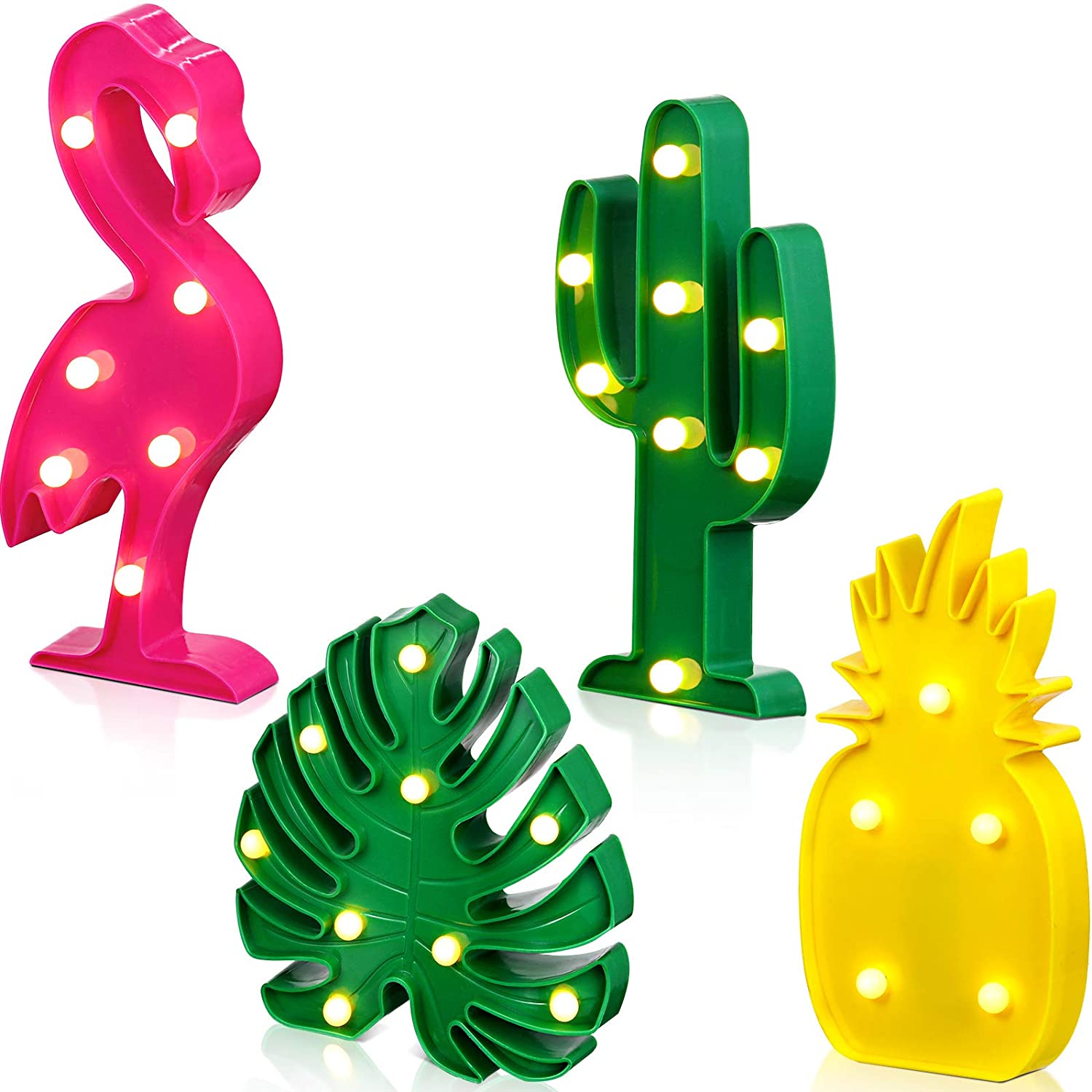4 Pieces Hawaiian Luau Party Lights, Flamingo Cactus Pineapple Leaf LED Sign Light, Battery Powered Table Lamp for Marquee Wall Table Desk Centerpieces Home Wall Kids Room Birthday Party Decorations