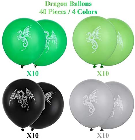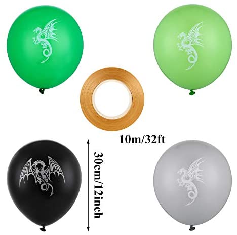 Adorable style: these balloons are printed with 2 different dragon patterns in silver, black, light green or dark green color, which contain typical dragon or medieval elements, these dragon balloons will form a childlike and lovable visual effect, can catch both adults and childrens attention and favor Sturdy material: these dinosaur dragon balloons are made of quality latex, sturdy and non-toxic to use, allow for air or helium inflation, not easy to burst suddenly; Latex product, a little smell is normal, just put it in ventilated place for 1 or 2 days to get rid of the smell Abundant package: this pack comes with 40 pieces of flying dragon balloons in 8 various styles, 2 rolls of gold ribbons for you, abundant quantity for you to make a balloon arch and decorate your party Wide occasions: our dinosaur dragon latex balloons can adorn your party to be joyful and vigorous, suitable for dragon or medieval themed birthday, Chinese New Year celebration, graduation, bachelor party, wedding, baby shower and other important events Dimension details: each flying dragon balloon measures approx. 30 cm/ 12 inches after inflation, the gold ribbon is approx. 10 m/ 32.8 feet in length, long enough for you to hang these balloons from ceiling, window, door or gather these balloons to create a balloon arch