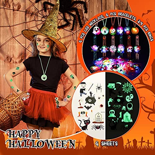 42pcs Halloween Light up Rings Halloween Treats LED Glow Rings Necklace and Luminous Tattoo Stickers Halloween Party Favors for Kids Adults Glow in the Dark for Non Candy Bag Fillers Halloween Toys