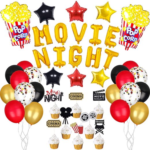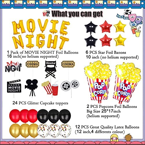 45pcs Movie Night Decorations,Movie Theme Popcorn Star Foil Balloons, Birthday Cupcake Toppers, Latex Balloons for Movie Themed, Movie Theatre Time…