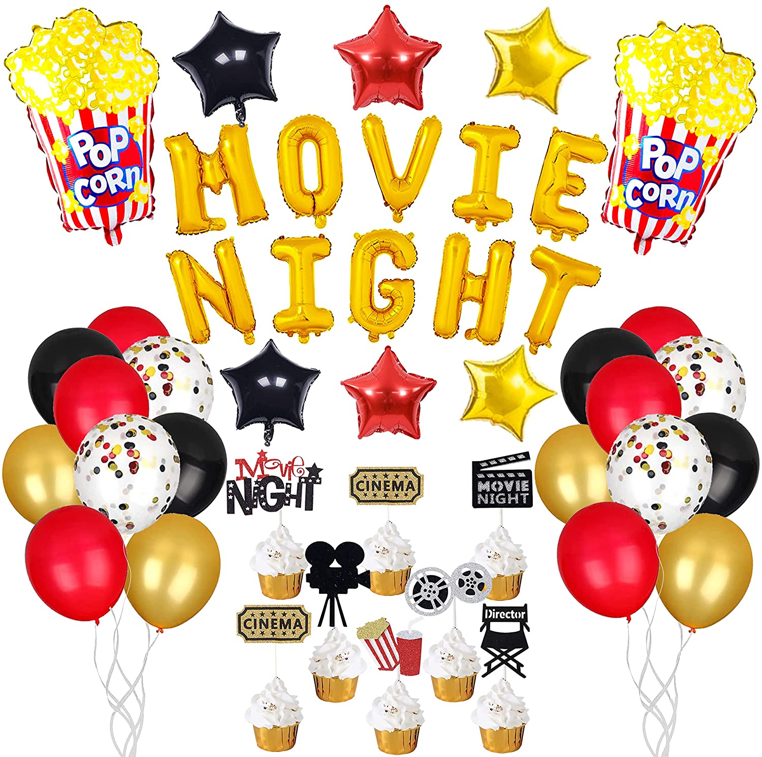45pcs Movie Night Decorations,Movie Theme Popcorn Star Foil Balloons, Birthday Cupcake Toppers, Latex Balloons for Movie Themed, Movie Theatre Time Party Supplies