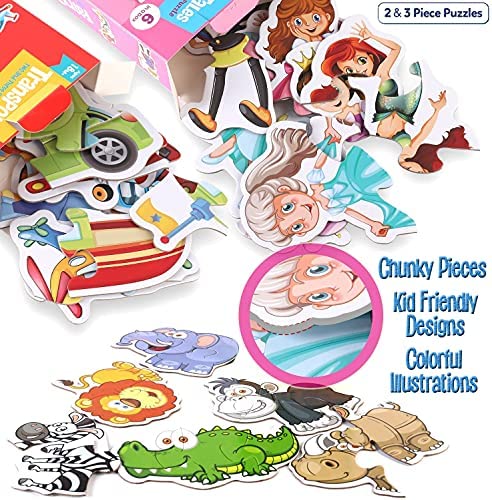 48 Pack My First 2 & 3 Piece Toddler Puzzles – Preschool Early Educational Jigsaws – Jungle, Princess, Farm, Construction, Sea Animals, Pets, Rescue, Vehicles