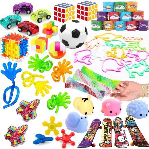 48 Pack Kids Party Favors Set Includes: [10] Silicone Bandz Bracelets [6] Unicorn Slap Bracelets [5] Mochi Squishy Toys [4] Sticky Hands [3] Puzzle Balls [4] Finger Skateboards [2] 3×3 Speed Cubes [1] Stress Football Squeeze Foam Ball [3] Mesh and Marble Sensory Toys [1] 3D Maze Puzzle [2] Shape Maze Puzzles [4] Pull Back Car [3] Finger Gyros