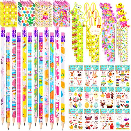 48 Pcs Easter Party Favor Stationery Easter Pencils Mini Coil Notebooks Rulers Tattoo Stickers for Kids Party Favor Fillers Classroom Reward Prizes Carnival School Supplies for Students