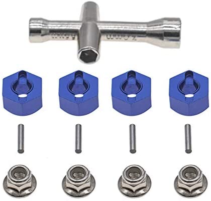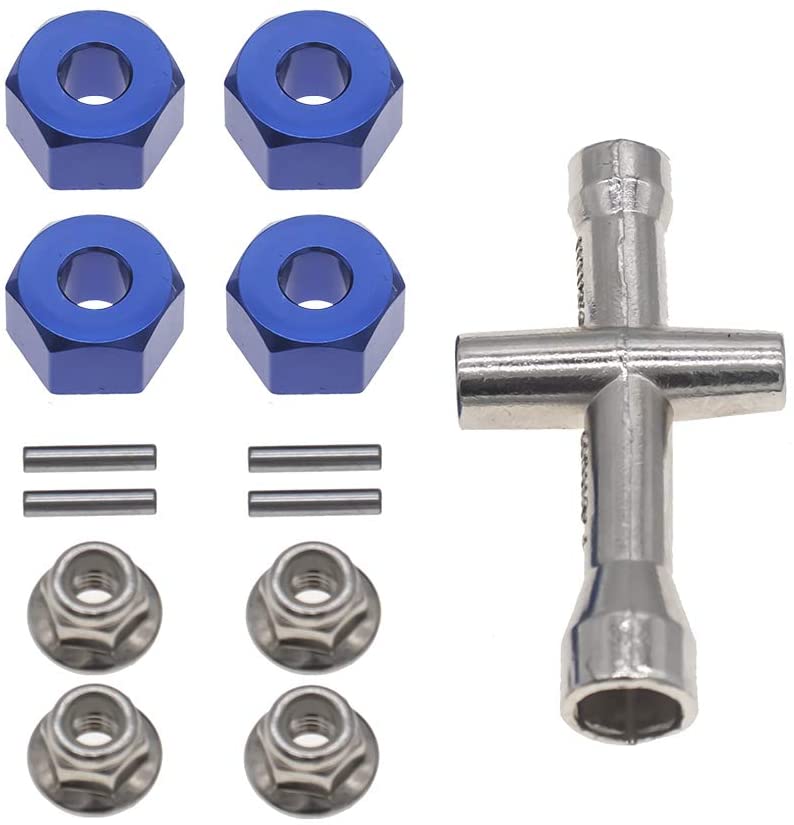 URCMaxs aluminum 12mm hex wheel hub adaptersFEATURE:With M4 Flanged Lock Nuts and 4mm 5mm 5.5mm 7mm cross Wrenches Maintenance ToolFit 5mm axles with M4 threadsMake sure Wheels with 12mm hex and 5mm min center holeSPECIFICATIONS:Thickness: 7mm/0.275“Outer Diameter: 12mm / 0.47“Inner Diameter: 5mm / 0.197”Material: Aluminum AlloyColor: Dark BlueYOU WILL RECEIVE: -Four (4) wheel hub adapters-Four (4) pins-Four (4) M4 Lock Nuts-One (1) Cross Wrenches
