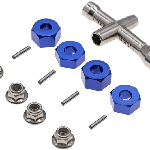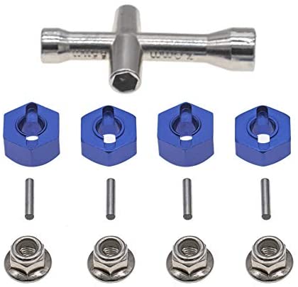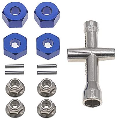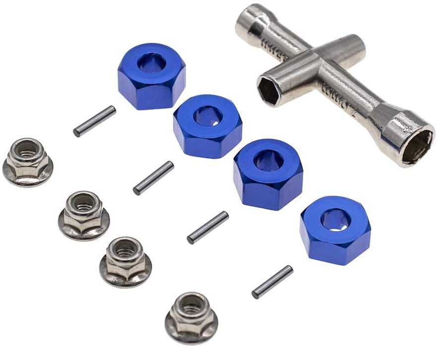 URCMaxs aluminum 12mm hex wheel hub adaptersFEATURE:With M4 Flanged Lock Nuts and 4mm 5mm 5.5mm 7mm cross Wrenches Maintenance ToolFit 5mm axles with M4 threadsMake sure Wheels with 12mm hex and 5mm min center holeSPECIFICATIONS:Thickness: 7mm/0.275“,5.5mm/0.216“Outer Diameter: 12mm / 0.47“Inner Diameter: 5mm / 0.197”Material: Aluminum AlloyColor: Dark BlueYOU WILL RECEIVE: -Four (4) wheel hub adapters-Four (4) pins-Four (4) M4 Lock Nuts-One (1) Cross Wrenches