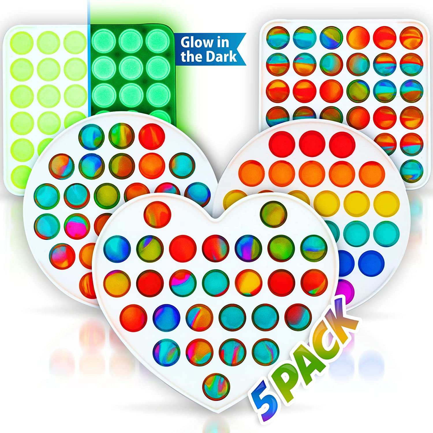 5 Pc Fidget Toy Pack – 1 Jumbo Heart Shaped Pop It, 2 Big Square Poppers, 2 Large Circle Popit. Rainbow, Tie Dye Colors, and Glow in the Dark Figit…