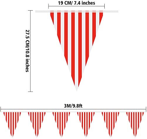 Carnival theme: the carnival pennant banner is reusable and wonderful for carnival birthday party decoration; The vibrant color and attractive appearance will coordinate with your carnival circus party theme Suitable size and durable material: red and white pennant banner is made of quality paper material, which is weather resistance; The bunting banner is 9.8 feet long and each triangle flag is 7.4 x 10.8 inches, each string contains 12 triangle flags Easy to use: you can hang the circus pennant banner at the door, trees, rope and windows; Pretty circus carnival party decoration will highlight your party, its length makes it easy to use indoors and outdoors Red and white striped: the triangle bunting flag is designed with red and white striped, classic pattern will complement your party, and make you and your guests more joyful to enjoy the carnival Wide application: nice for carnival circus party, grand openings, birthday parties, and other special occasions worth celebrating, which will create more festive atmosphere for you