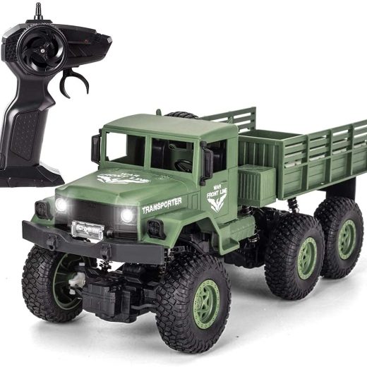 SIMULATION DESIGN ARMY TOYS High simulation of real military truck structure. Real rubber vacuum tire. Simulating the original truck dual-lamp design, the front LED lamps provide you sufficient lights to operate the truck at night or in dark places.