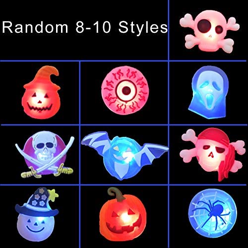 50Pack Light Up Rings Glow In The Dark Halloween Party Favors for Kids & Adults Specification: Style: Ghost, Pumpkin, Pirates, Spider Etc, (Random Style) Dimension: 0.98 x 1.4in Materiel: Nontoxic Plastic Suitable Age: safe for kids age 3+ Feature: -The light constantly flash and shift between different colors, very eye-catching in the dark. Just put them on and have fun! -Batteries are included and installed. ON/OFF switch controlled by yourself, easy and ready to use. -Great for Christmas, Halloween,concert, weddings, birthday parties or other festivals, bring much fun for you on the party. Package includes: 50 x LED Rings/Random Style