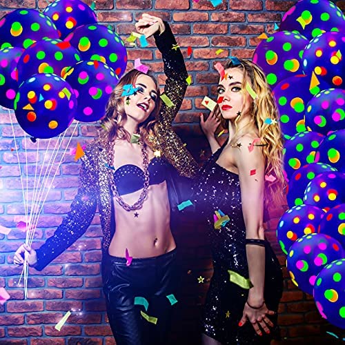 Glow in the dark: these beautiful fluorescent balloons emit fluorescent effects under specific UV lights at night; They are a nice complement to your party decoration; Their bright polka dots will create a romantic and exciting atmosphere for you and your guests or friends to enjoy the party Safe material: these mini round party balloons are made of quality latex material, durable and safe, and they can be filled with helium; Each balloon is printed with mini polka dots in green, yellow, orange, purple and pink, which will shine in the dark wherever you go, adding more fun to your party Atmosphere enhancement: different from traditional balloons, these neon party balloons feature small dots in vivid fluorescent colors, making it easy for your guests to notice them at a glance; In addition, the balloons will glow in fluorescent neon lights, which will provide you with an impressive and colorful party Wide ranges of uses: these luminous party supplies look bright in the sun, while they will glow in black light and dreamy light, bringing a beautiful visual effect for your party; The glowing neon balloons are suitable for most occasions, including black light parties, neon theme parties, birthdays, weddings, growth parties, stage decorations, carnivals, dance parties and other occasions that are in need of neon decorations Package includes: there are 50 pieces of 12 inch black light latex balloons printed with neon fluorescent dots; Each balloon is designed with 5 colors of mini dots, rich in quantity and style, which can meet your decoration needs and make your party full of fun
