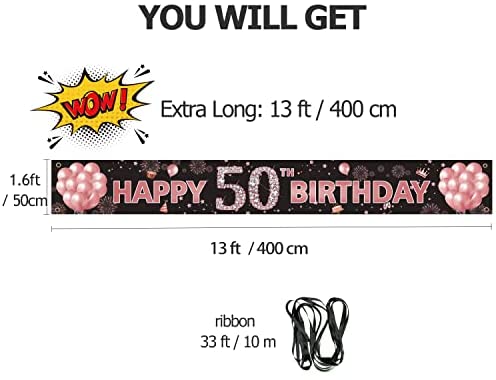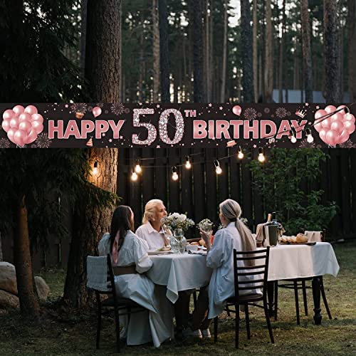 50th Birthday Decorations Yard Banner for Women, Rose Gold 50 Year Old Happy Birthday Decorations Signs, Fifty Birthday Party Decoration Backdrop Supplies, Extra-Long 13ft x 1.6ft Indoor Outdoor PHXEY