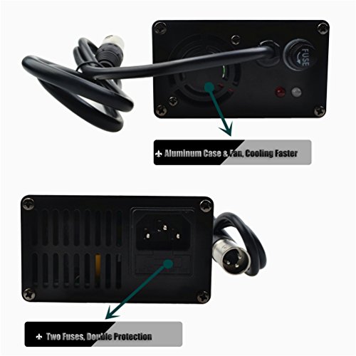 NTC inside charger, Fan start working automatically when charger temperature reach 40Specification:Model: UY240 Dimensions: 170x90x50mm Battery type: Li-ion battery Working power: 90-110Vac, 50 ~ 60Hz Suitable for Battery Voltage: 50V/51.8/52V Output voltage: 58.8V (For 14S Li-ion Battery) Output current: 4A battery Protection: SCP,OVP,OCP,OTP Charging mode: constant current – Constant Voltage – trickle (floating charge) three-stage intelligent charging Charging efficiency: =85% (full load) Working temperature: -5 ~ +40 Storage temperature: -40 ~ +70 AC power cord, DC connector can be customized. Operating Instruction1. Before charging, please connect the DC terminal to battery first, and then connect the AC terminal.2. After charging complete, unplug the AC terminal firstly, and then unplug the DC terminal.3. No charging or after charging complete, be sure to unplug the DC terminal and AC terminal.LED Indicator:LED 1 red: Power on.LED 2 red: Battery being charged.LED 2 Flash: Battery will be charged completely soon.LED 2 green: Battery has been charged completely.Package:1* 58.8V 4A charger1* US standard power cable1* Operating manual1* Female connector2* Fuse for replacing