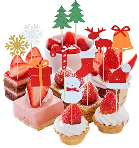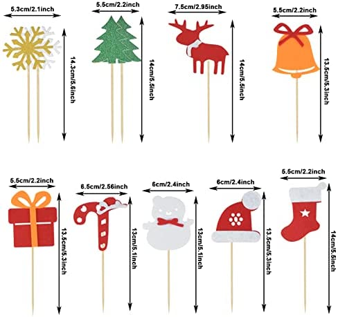 Specifications: Material: paper, felt and wood Color: multi color Size: as the pictures Quantity: 51 pieces Package Include: 10 x Gold snowflake Christmas cupcake toppers 10 x Silver snowflake Christmas cupcake toppers 10 x Chirstmas tree cupcake toppers 3 x snowman cupcake toppers 3 x Christmas bells cupcake toppers 3 x Elk cupcake toppers 3 x Gift box cupcake toppers 3 x Crutch cupcake toppers 3 x Hat cupcake toppers 3 x Sock cupcake toppers Note: They are for food decoration only, please do NOT put them in the oven or microwave.