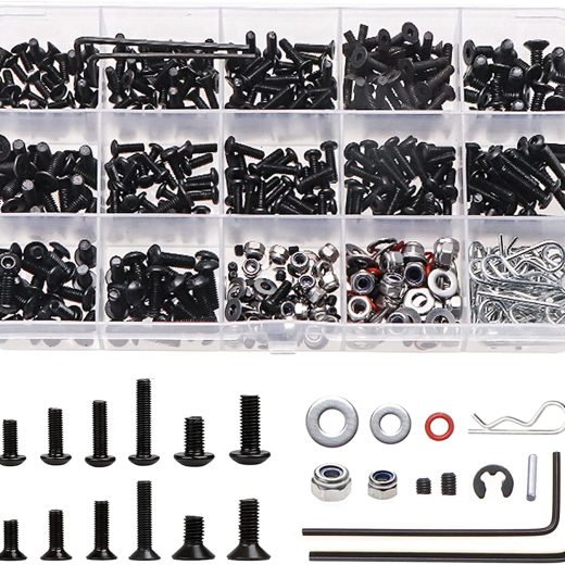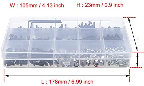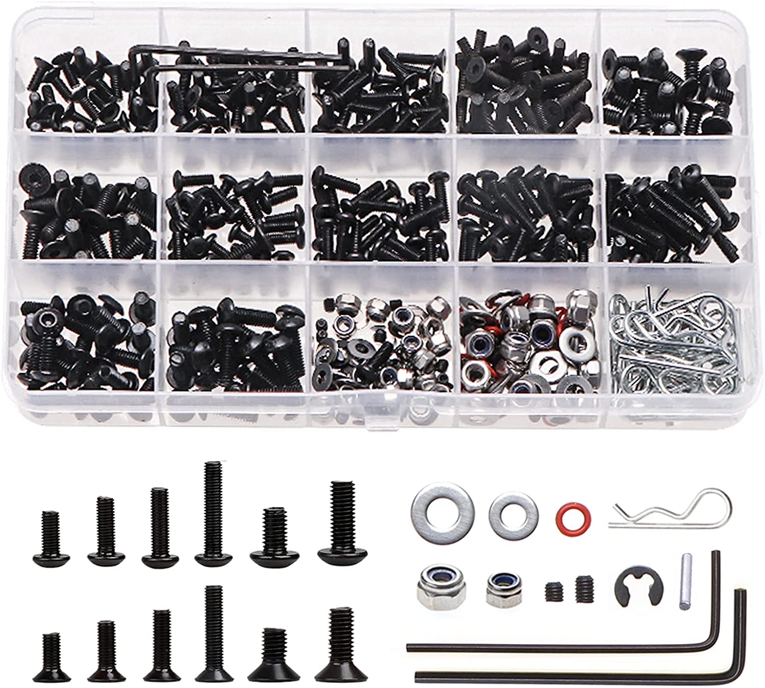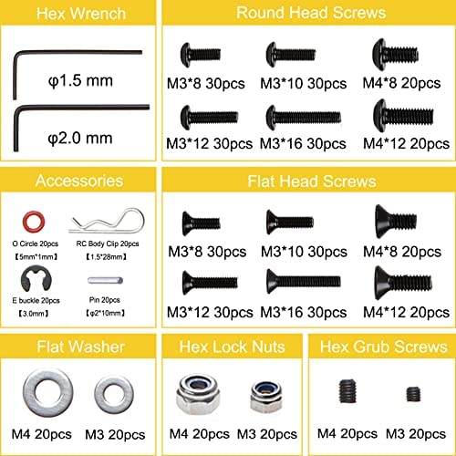 M3 and M4 Hex Flat And Button Head RC Screws Kit Tool Set with M3 Bolt Washer, Lock Nut, Rc car Body Shell Clip, E-Clip, Pins and O-CircleHardware Fastener RC Car parts For 1/8 1/10 1/12 Scale RC Cars Crawler Truck.Material: The RC Screw kit are made of carbon steel, Screw nuts and gasket are made of 304 stainless steel, RC Screw box is made of plastic, the screw kit with excellent rust-proof and corrosion resistance property. Durable and long service-life. Ensurance the reliability of the fastening for your rc carthe plastic box has 15 of different grids in for easy Organization and usage.Package List:Flat Head M3 Screw:8mm X3010mm x3012mm x3016mm x30Flat Head M4 Screw:8mm x2012mm x20Round Head M3 Screw:8mm X3010mm x3012mm x3016mm x30Round Head M4 Screw:8mm x2012mm x20Grub Head Screw:M3 3mm x20M4 4mm x20Hex Lock Nuts:M3 3mm x20M4 4mm x20Flat Washer:M3 3mm x20M4 4mm x20RC Body Clip1.5*28mmx20O Circle5mm*1mmx20Pinf2*10mmX20E buckle3.0mmx 20M3 Hex Wrenchf1.5x1M4 Hex Wrenchf2x1Note: Please check the your model for compatibility before placing an order