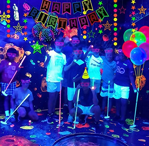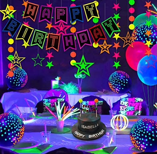 53 Pieces Glow Neon Birthday Party Supplies – Neon Balloons, Glow in the Dark Happy Birthday Banner with UV Black Light Reactive Cake Topper, Hats, Circle Dots Stars Garlands and Hanging Decorations