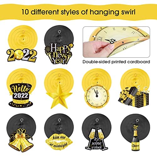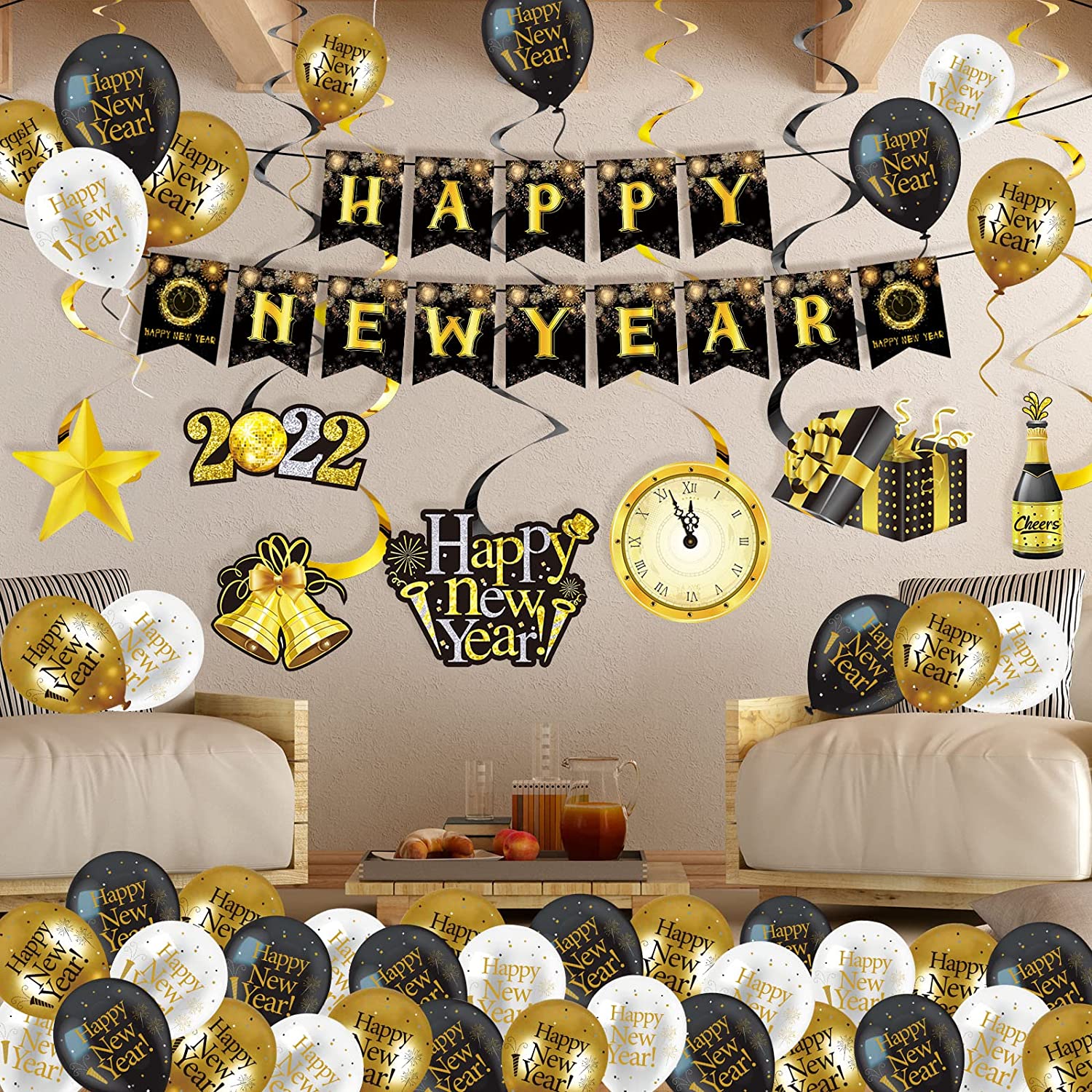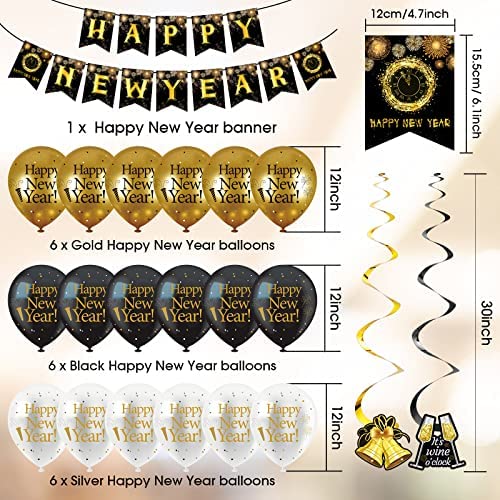 54 Happy New Year Party Decorations 2022 Kit, Include Black Gold Glitter Happy New Year Banner, Hanging Swirl and Celebration Card, Black Gold Silver Balloons for New Years Eve Party Supplies 2022