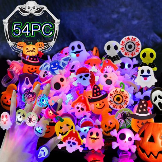 54PC Halloween Light Up Ring Halloween Party Favors LED Glow Ring for Kids Non Candy Gift ( 12 Styles Flashing Rings )