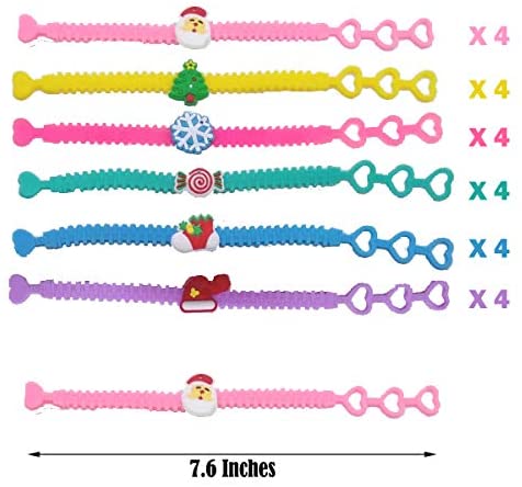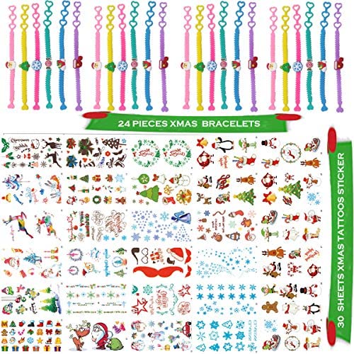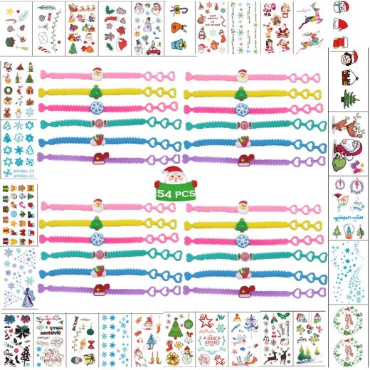 54PCS Christmas Silicone Bracelets Party Favors for Kids Adults, Xmas Rubber Wristbands Bulk Santa Gift Toys Prizes for Holiday Decoration Wrist Band Party Supplies, Party Goodie Bags, Bonus Tattoos