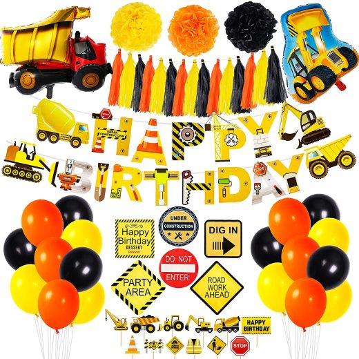 55 Pack Construction Birthday Party Supplies Dump Truck Party Decorations Kits Set with Excavator Foil Balloon,Balloons Garland,Tissue Pom Pom,Tassel,Birthday Banner for Boy Birthday Party Decorations