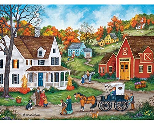 Detailed classic Americana folk art 550 Puzzle Pieces Finished 18 inch x 24 inch Artwork by popular puzzle artist Bonnie White Thick recycled puzzle board and random cut pieces ensure a tight interlocking fit and create a fun experience