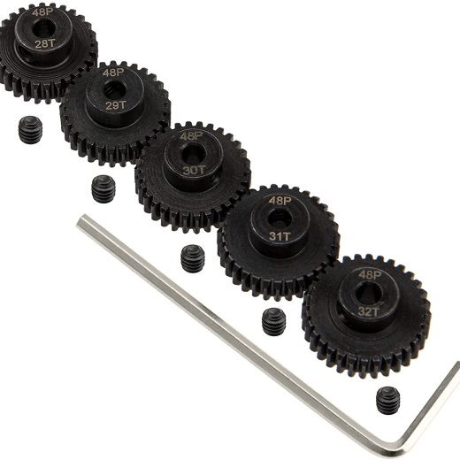 Fit 3.175mm Shaft Size Motors,please make sure the RC motor shaft have the same diameter,Also make sure the spur gear and pinion gear have the same pitch, otherwise the teeth wont mesh. For 3.175mm shaft motor of 1/10 RC Car.Compatible with Arrma HPI Kyosho Losi Axial Traxxas Tamiya Associated 1/10 RC Car Monster Truck Buggy The 48P pinion gear sets are made of hardened steel,durable and reusable. Universal upgrade 48P pinion gear,total 5Pcs,28T 29T 30T 31T 32T with 3.175mm inner diameter. The variety of tooth pinions allows for more gear setups,for different racing track conditions. To avoid the ESC/motor overheat,please check the ESC and motor temperatures regularly throughout the run after change the pinion gear. Easy to install and upgrade.Come with grub screws. Material:Steel Tooth count: 28T 29T 30T 31T 32T Tooth pitch: 48 pitch Height: 9mm For shaft: 3.175mm(1/8-Inch) Package includes: 5x Pinion gear(28T 29T 30T 31T 32T) 5x Grub screws