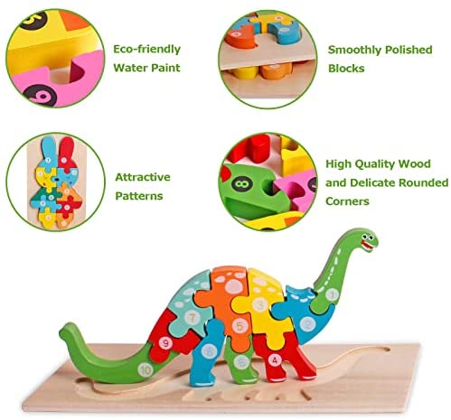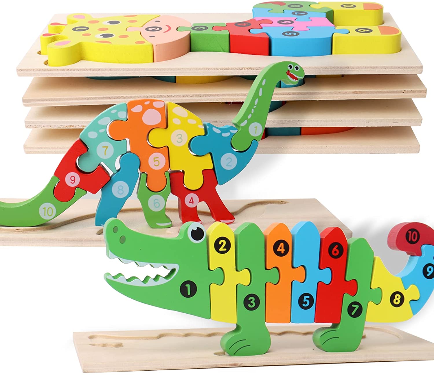 6-Pack Wooden Toddler Puzzles for Kids Ages 2-4 Number Puzzle for Toddlers 3 Years Old Wooden Dinosaur Puzzles for Toddlers 3-6 Years Animal Jigsaw for Toddler Toys Boy Girl Gift