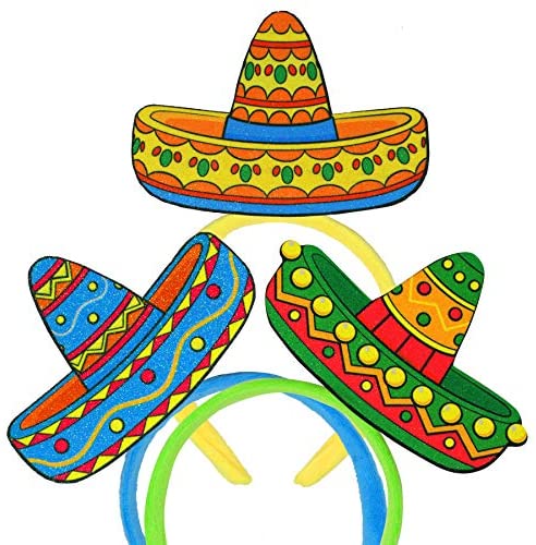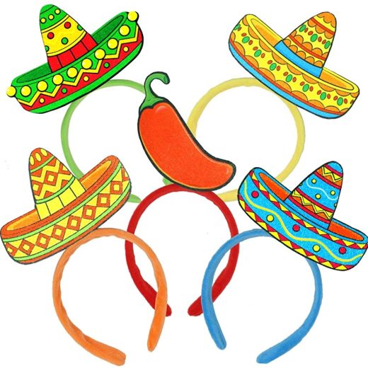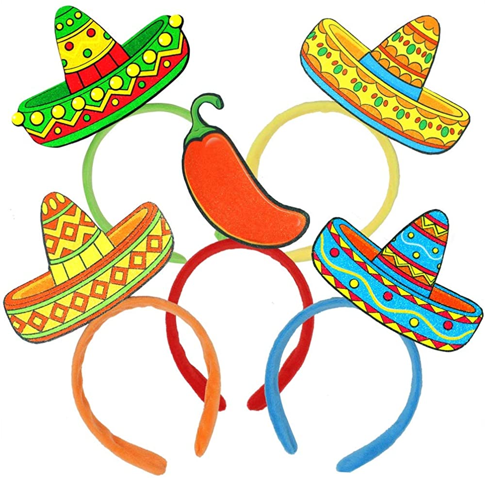 6 Packs Fiesta Sombrero Mini Party Headbands set includes 6 different designs: Floral headband, Red Jalapeno and 4 other Different Colors Sombrero….