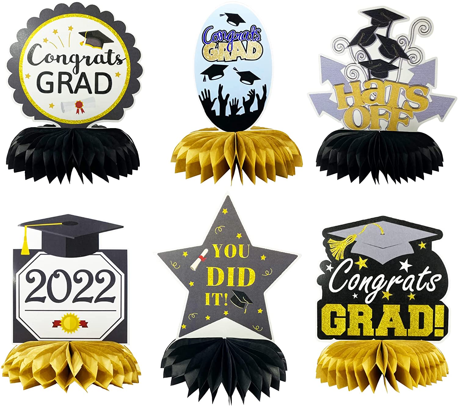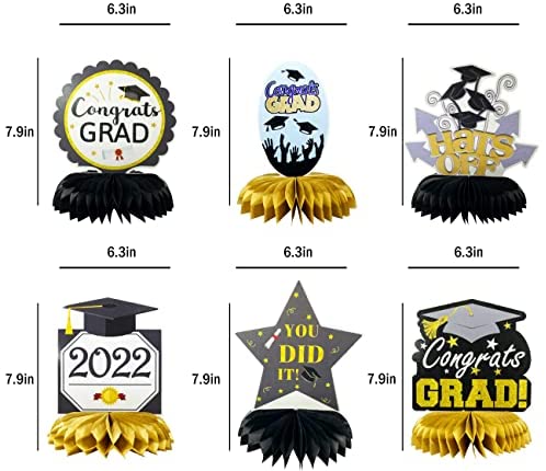 Package: you will get 6 pieces of congrats grad honeycomb centerpieces including stars, insignias, diplomas, and so on. The black and gold graduati…