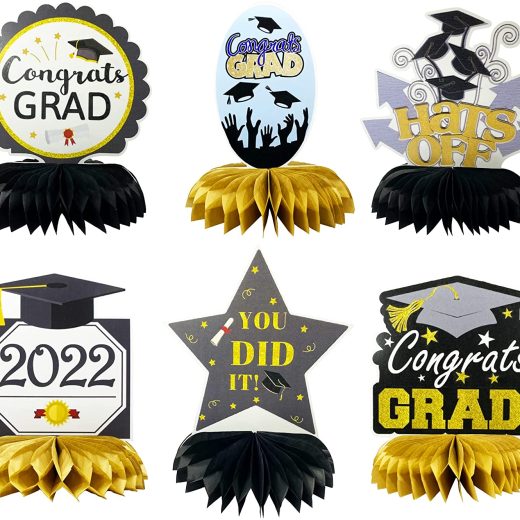 Package: you will get 6 pieces of congrats grad honeycomb centerpieces including stars, insignias, diplomas, and so on. The black and gold graduation table centerpieces are sturdy, that are appropriate decorations at your graduation party.These graduation table decorations are about 6.3 x 7.9 inches, add some atmosphere by setting these gold decorations for the graduation party in the middle of the table and these cool graduation decorations are impressive enough to be noticed.Durable quality: the graduation table centerpieces are made of sturdy card stock with surface laminated and delicate printing technology; These graduation table toppers are sturdy, non-toxic and no odd smell, which are a good choice for your graduation party.How to use: Step1, tear off the sticker of the honeycomb ball. Step 2, stick the honeycomb ball to a fixed area on the card. Step 3, repeat on the other side of the card. Step 4, put it stand on wherever you want.Great graduation party supplies: these graduation table centerpieces exquisitely designed with interesting graduation elements so that everyone will love these chic designs. Decorating your home and party with our honeycomb centerpieces will be a big hit at your party.