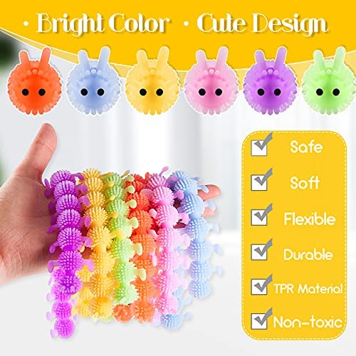 Luminous fidget toys: you will get 6 pieces of bright color and cute luminous sensory fidget toys in different colors, with small spiky texture about 20mm, which will better stimulate your tactile sensitivity, bringing you a new good tactile experience; They can also absorb light and glow in the dark Fun learning tools: playing with the fidget sensory can increase hand and arm strength; The luminous items feature vibrant and various colors, which color schemes are similar to macaron cakes, helping boys and girls identify colors and giving a warm sense of happiness; Whats more, quiet toys make no noise when playing Safe and easy to clean: made of safe TPR rubber, fuzzy stretchy item is waterproof, non-toxic, elastic, soft and easy to stretch, durable and it has high tears and abrasions resistance, so you can play at will; It is also easy to clean, you just wipe it with a damp cloth or wash directly with water to restore clean Lightweight and durable: each luminous caterpillar fidget toy is about 10 inch long and weight 0.06 lb; These stretchy noodle toys can be stretched to about 60 inches and they will not hurt your hands when you loosen them; They are easy to be carried anywhere, such as school and workplace, fitting for keeping your boys and girls calm and relaxed while waiting and traveling Quiet anxiety reducing toys: it is funny to pull, rotate and wrap the glow in the dark noodles play toy and then watch them spring back to their original shape; They are great for sensory and tactile stimulation, avoiding hair pulling, nail biting and other bad habits