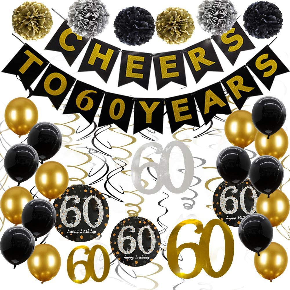 60th Birthday Decorations for Men Women 60th Birthday Banner Cheers to 60 Years with 60th Hanging Swirls Black and Gold 60th Party Decorations