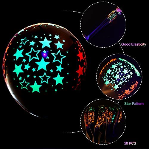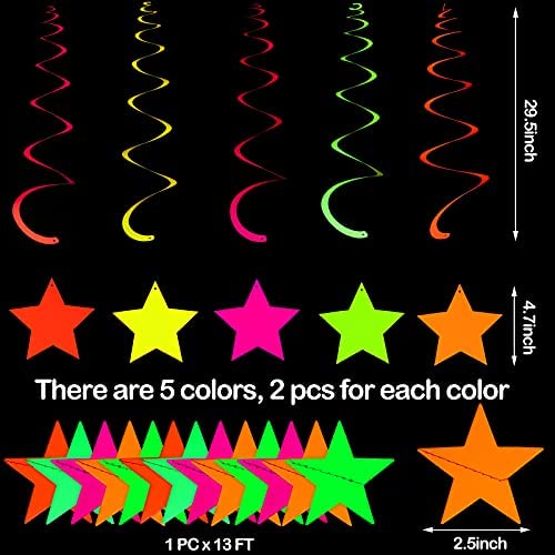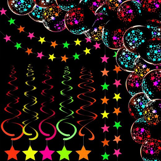 61 Pieces Neon Balloons Party Supplies Glow Party Sets Including 50 Pieces 12 Inch UV Glow Balloons 14 Ft Neon Star Garland 10 Pieces Neon Star Swirl Hanging for Birthday Wedding Arch Party Decoration