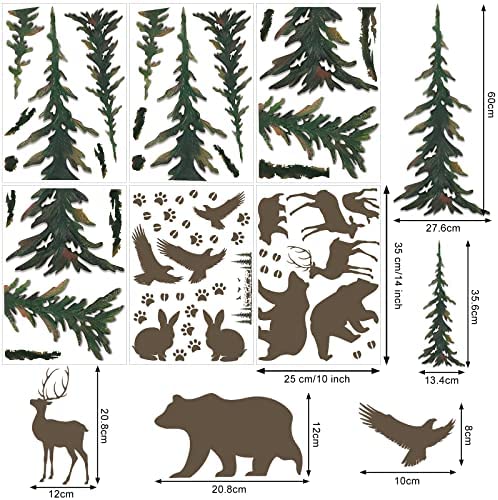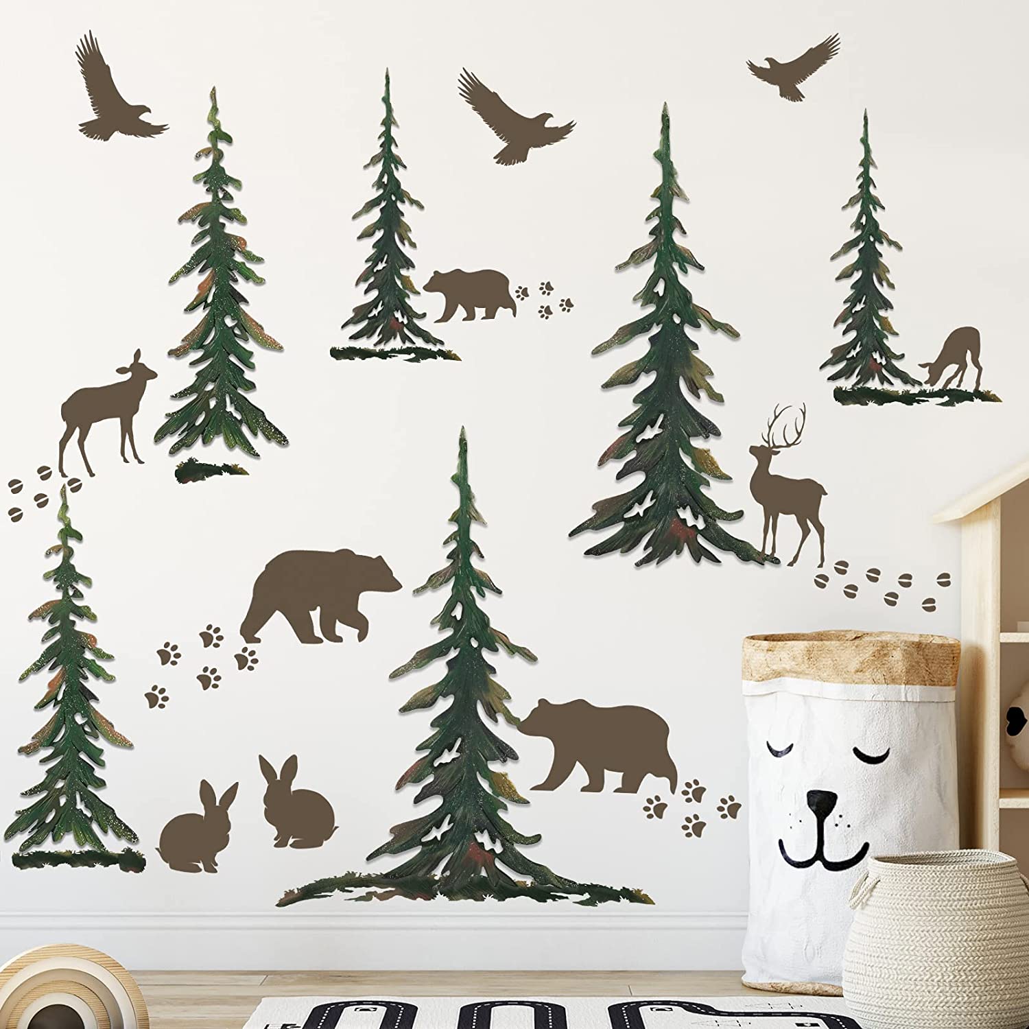 62 Pieces Forest Wall Decal Wild Animal Nursery Wall Decals Woodland Vinyl Wall Decals Forest Wallpaper Pine Tree Forest Decor Forest Animal Bear Deer Wall Sticker for Christmas Kids DIY Bedroom