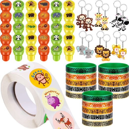 63 Pieces Jungle Safari Party Favors Set, Goodie Bag Stuffers Jungle Theme Birthday Party Supplies with Animal Silicone Bracelet Stamper Sticker Keychain, Animal Party Supplies for Kids