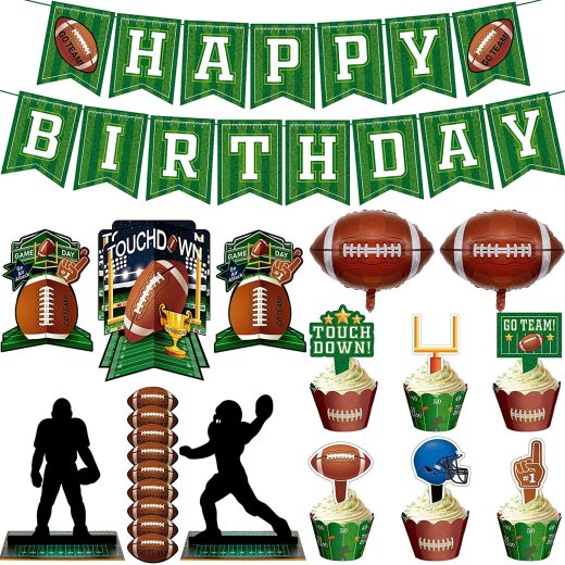 Features:Ideal gift:Football theme party supplies will be practical and creative gifts for family, friends, colleagues and neighbors. The gift receiver will love them deeply because they can also match them with other supplies to create a complete football festival atmosphere, and have a wonderful party time.Cupcake toppers and wrappers:Our football cupcake toppers and wrappers are made of quality card stocks with nice printing, and you can place your cupcake inside the wrapper for an eye-catching look, which can well decorate the cake, and are wonderful football themed party supplies and decorations.Specifications:Color: as pictures showSize: as pictures showPackage includes:1 x Football birthday banner1 x Big three-dimensional table topper2 x Small three-dimensional table toppers20 x Small football cards2 x Black wood player silhouettes18 x Small football cupcake toppers with 6 types18 x Football cake wappers2 x Footabll balloonsNotes:Manual measurement, please allow slight errors on size.The color may exist slight difference due to different screen displays.The words engraved on the product mean to encourage, have nothing to do with the trademark. Our trademark is Chinco.