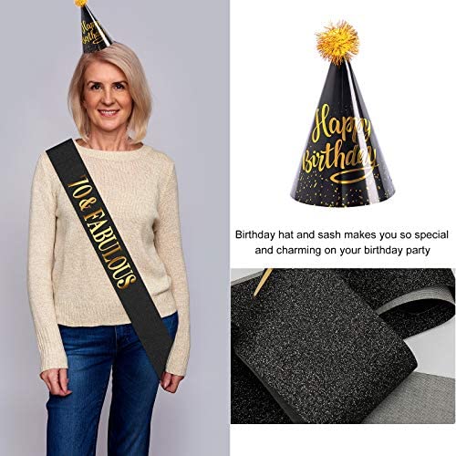 70th Birthday Decorations for Women Or Men Black & Gold, 70 Birthday Party Supplies Gifts for Her ( Him) Including Happy Birthday Balloons, Fringe Curtain, Tablecloth, Photo Props, Foil Balloons, Sash