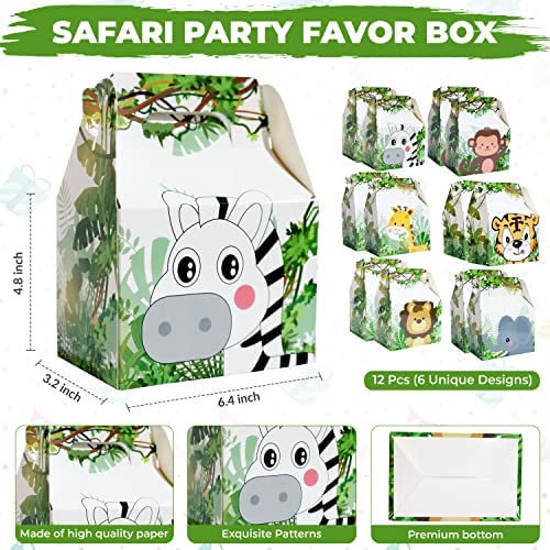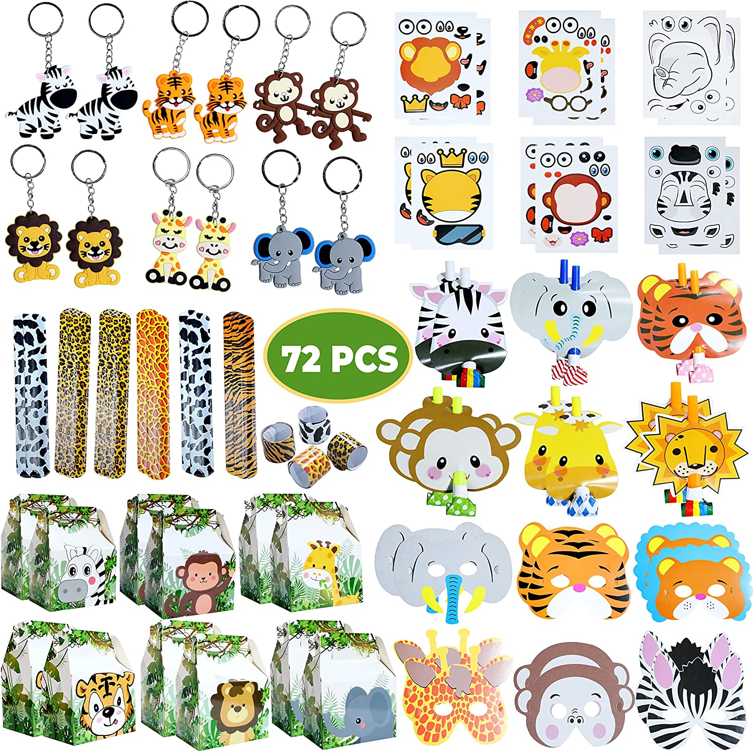 72 Pcs Jungle Safari Party Favors, Zoo Safari theme Birthday Party Supplies with Treat Box, Slap Bracelets, Felt Animal Masks for Kids, Keychains, Blowers, Stickers for Goodie Bag Fillers