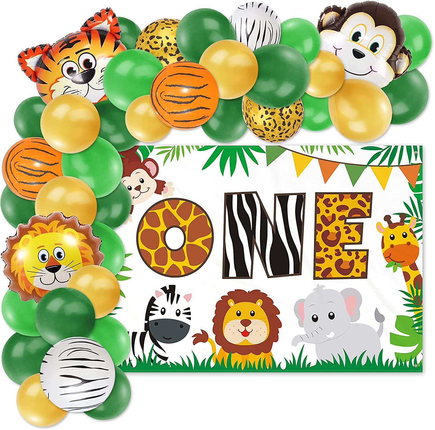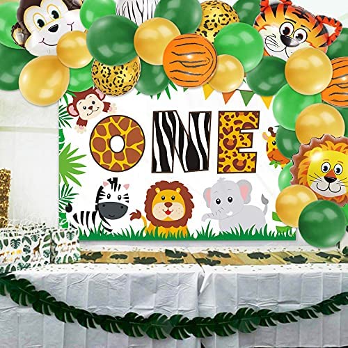 73pcs Safari Animals One Year Old Birthday Party Decorations for Baby Boy, Lion Elephant Zebra Backdrop Banner & Balloon Garland Kit, Jungle Wild Animal 1st Birthday Photography Background Photo Prop